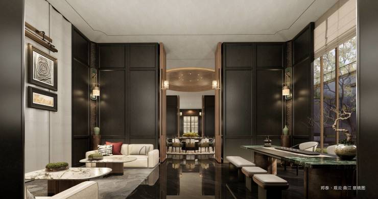 以悬浮式下沉庭院,转译盛唐亭台楼阁意境,融梨园宴饮之风雅,再造现代版“曲水流觞”之趣。力求“宅、园、水、院”立体交融,借天地之景纳四时之变,营造出休憩、观景、交流多元立体社交会客厅。