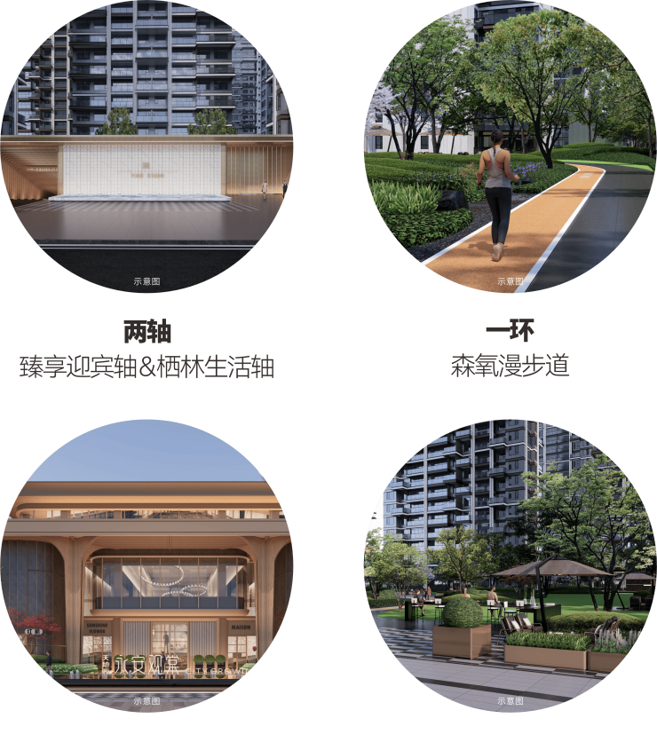 以“度假感”“无龄界”“原森态”为理念,通过“两轴一环三庭四境”的景观结构串联整个大区,打造礼序归家与度假日常的无界绿洲