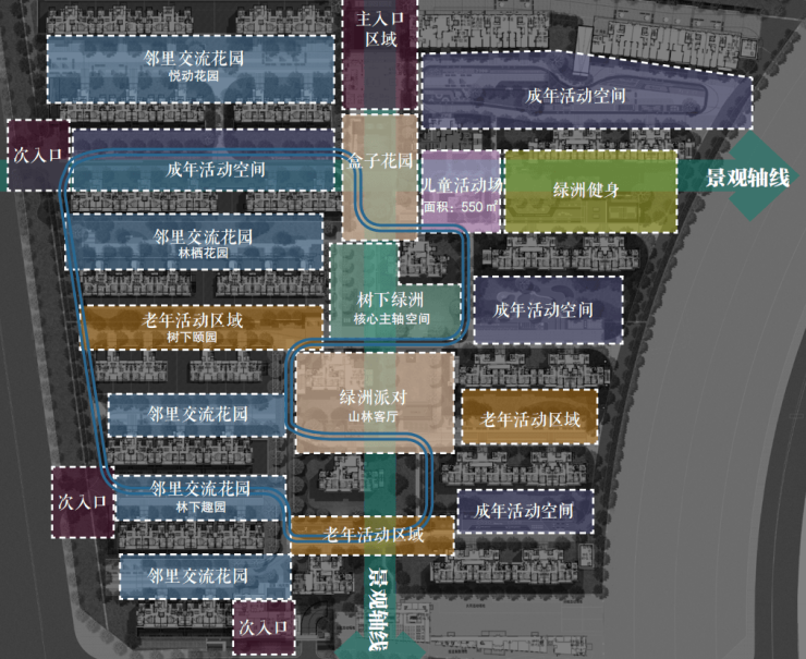 项目以风车十字中轴进行空间格局规划,打造五重酒店式尊享归家轴、约500米中央景观轴、约1250㎡主题全龄复合活动场地、约870米微汗有氧健身跑道系统、6大组团17处邻里花园、架空层活动空间。