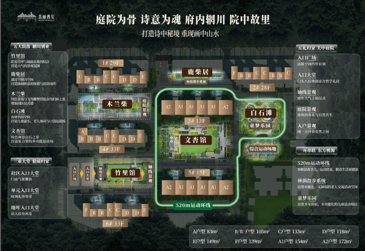 【府院规制 诗意园林】融合中国千年府院文化与当代生活情境,于主城之上定制“辋川故里”院落体系,设置三重入户礼仪大堂、五重归家礼序节点、五大主题院落景观、约520米运动环线、三大复合活动场地,将细小日常容纳进社区场景,让归家成为全家庭的归心。
