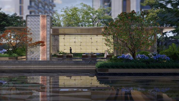 以安缦酒店设计风格为基底,落客区以花草、水景、立塑为景,营造出艺术质感,飞檐屋顶、屏风外墙与大面玻璃、金属线条所形成的归家大堂,多元交融氛围之中,也让每一位归家业主能够将都市繁忙与归家放松的转换悄然完成。
