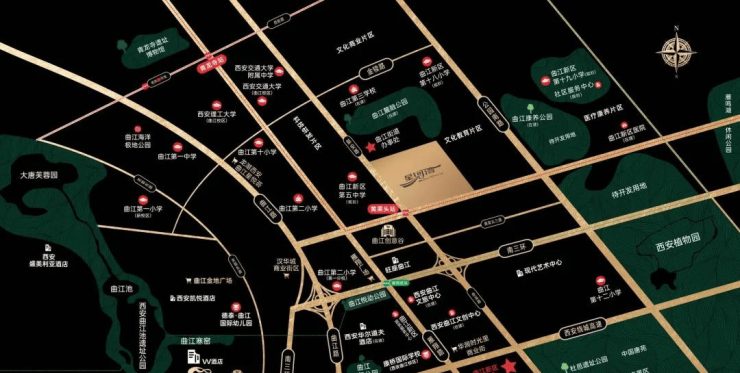 【曲江星河湾项目】位置:曲江QCIC板块,创意谷东北侧、属于曲江产业园之一的西安文化科教园封面位置。黄渠头二路和新安路交汇处东北角。