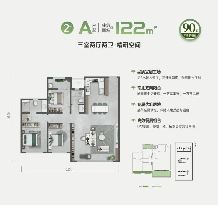得房率:小高层得房率超过90%,洋房得房率约100%