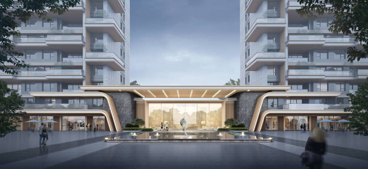 通过大面积玻璃+基座石材一体板+石材肌理铝板一体板,局部镶嵌铝合金属线条+涂料,项目以流动对称的韵律、极具辨识度的金黄色彩,犹如一幅“金色画框”,镶嵌于立面之上,辉映四季美景。