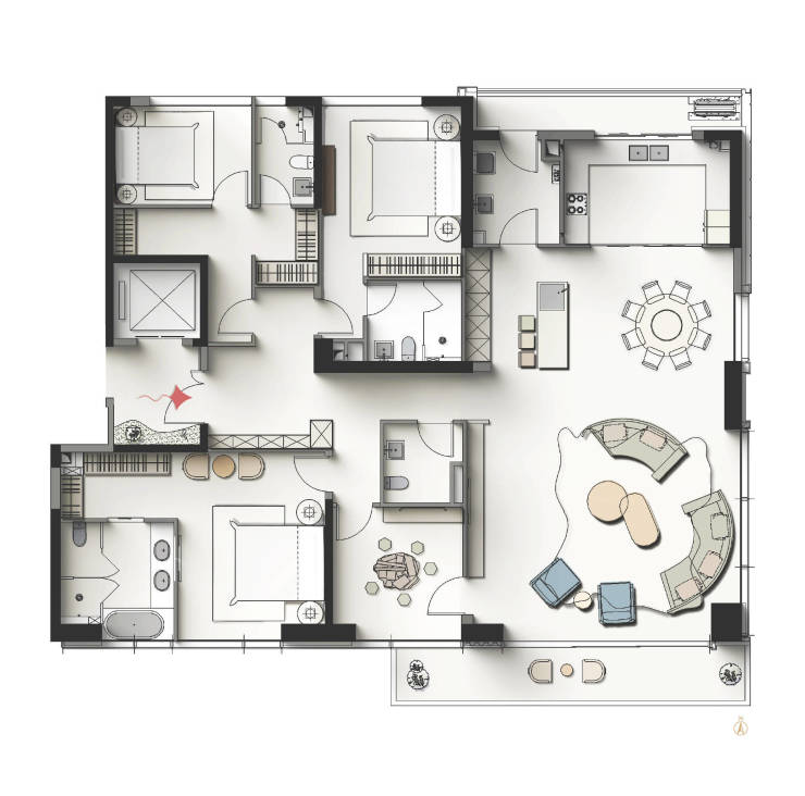 外立面部分采用玻璃幕墙+铝板,通过体块的进退、材质的分色,消解建筑的体量感,勾勒出更为轻盈优美的建筑剪影,造就独立于城市建筑主色和主流生活审美的高级住宅