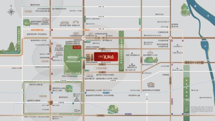 项目西邻教育用地、约1km西安市第48中、约2km锦园陕师大附中附小、约2.6km西安市第38中、约3km西安市第89中分校、约4.5km西安市大明宫中学