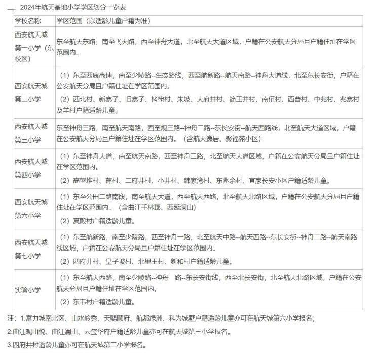 西安(航天基地)2024年义务教育公办学校学区划分方案
