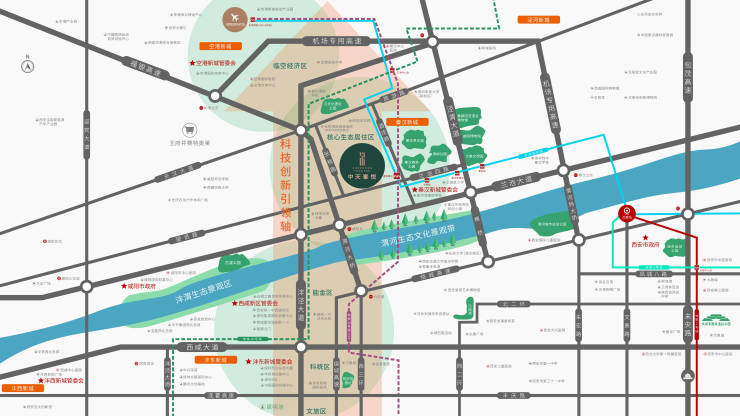 项目位于西侧,纵贯西咸新区,南起秦岭,北至嵯峨山。穿沣河,越渭水,长达80公里,它被誉为大西安经济强势崛起的神秘力量——科技创新引领轴。秦汉中央居住区板块以低密天然氧吧,遗址保护,城市绿化为主体。