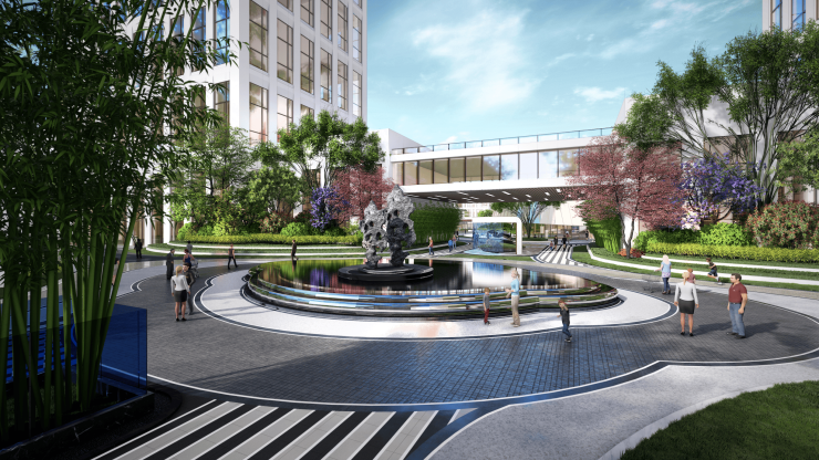 建筑单体进行四周绿化,五重绿化园林的设计,结合水系的穿插,形成“绿地包围建筑”的空间模式,极好地维系了整个产业园的生态环境