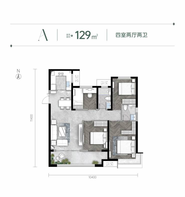 A户型 | 建筑面积约129㎡ | 四室两厅两卫