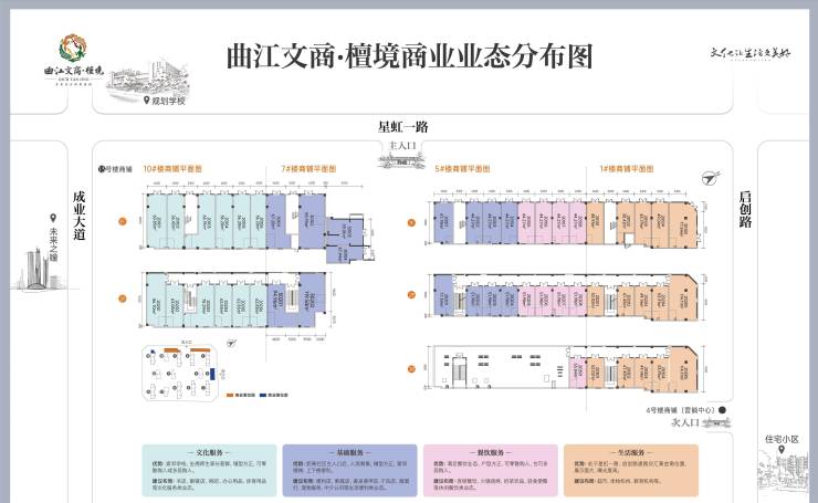 星虹一路与启创路、成业大道黄金双十字路口,周边1公里内少见的主街单排底商,低商住配比,客群依赖度高,形成一站式中芯消费地