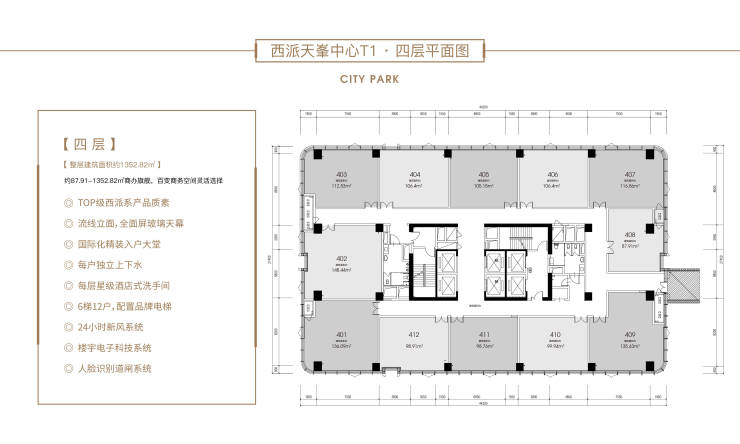◎TOP级西派系产品质素 ◎流线立面全面屏玻璃天幕 ◎国际化精装入户大堂 ◎每户独立上下水 ◎每层星级酒店式洗手间 ◎6梯12户配置品牌电梯 ◎24小时新风系统 ◎楼宇电子科技系统 ◎人脸识别道闸系统