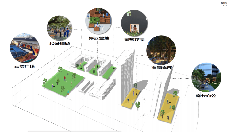 采取循序渐进的方式,规划了“摩卡办公-有氧客厅-星梦花园-浮云营地-悦梦漫游-云梦广场”等主题空间。