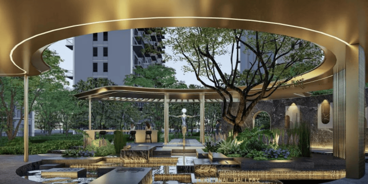 汲取玉璧、皮影、印玺等东方美学灵感,引入幸福林带绿意,同源全球度假酒店,以商办共享+社区私享多元复合,规划“一环一轴多节点”雅奢艺术园林,营造艺术森居场景体验,打造可居可赏、可游可玩的长者花园、青林茶话、活力球场、儿童乐园等乐活场域。