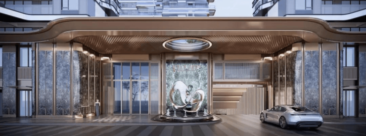 高奢迎宾大堂挑高约5米,奢石、金属、玻璃等材质重叠互映,以极致奢华气场营造尊崇归家礼仪。