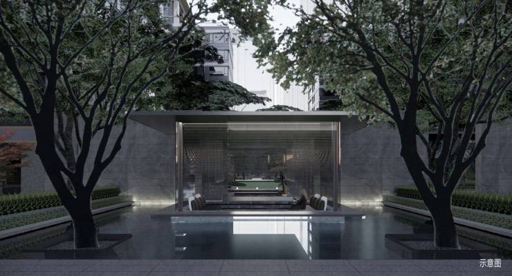 中海·开元壹号|紫宸归家礼序门楼延伸出的连廊空间,被水环绕,两侧镜面水景,点缀树阵,在清风摇曳中享受归家静谧。