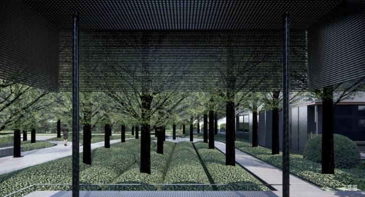 园林景观汲取唐文化元素加以提炼,转变成亭子的建筑语言,结合阵列的乔木与下沉式的草坪强调横向的轴线感,营造禅意感,打造丰饶的自然境界,丰盈的精神世界。
