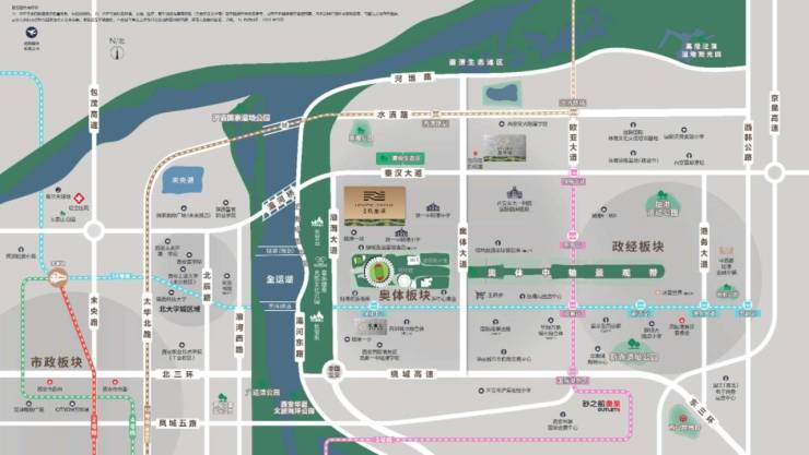 文体:奥体大道向南2公里直达奥体中心,内置的多场馆可满足日常游泳、篮球等健身运动,亦可随时观看主场馆举办的赛事、演唱会等,不用担心因此带来的噪音污染、灯光污染、道路封闭带来的困扰。