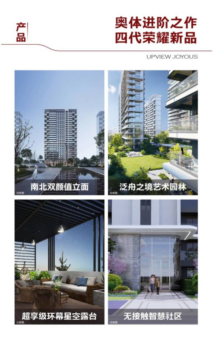 1、 双颜值立面:作为国际港务区西北门户,打造南北双颜值峯范立面,所有楼栋窗户采用蓝色全系三层中空low-e玻璃;优雅曲线游走于天际,代言奥体新一代标杆建筑美学 ,270°全幕景观视野。