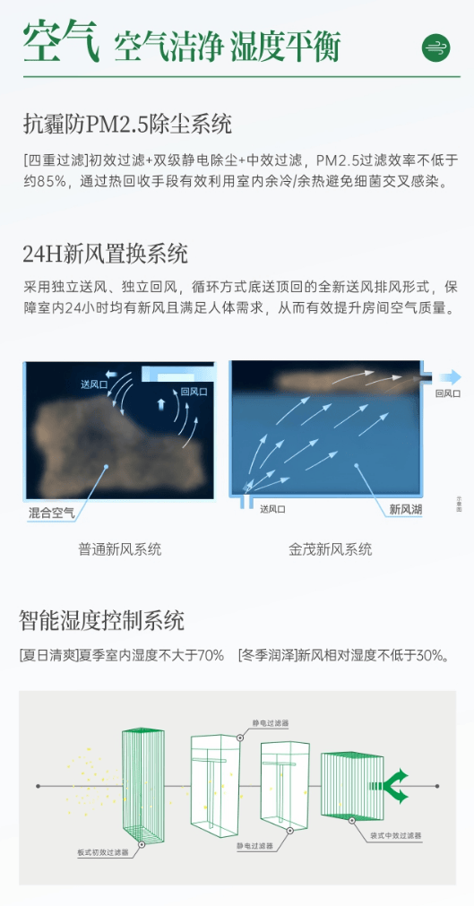 从“温度、湿度、空气、阳光、水、声音”六大基本生命元素延伸12大科技体系,实现“舒湿、舒温、舒氧、舒音、舒静”的居住环境,一年四季如春。