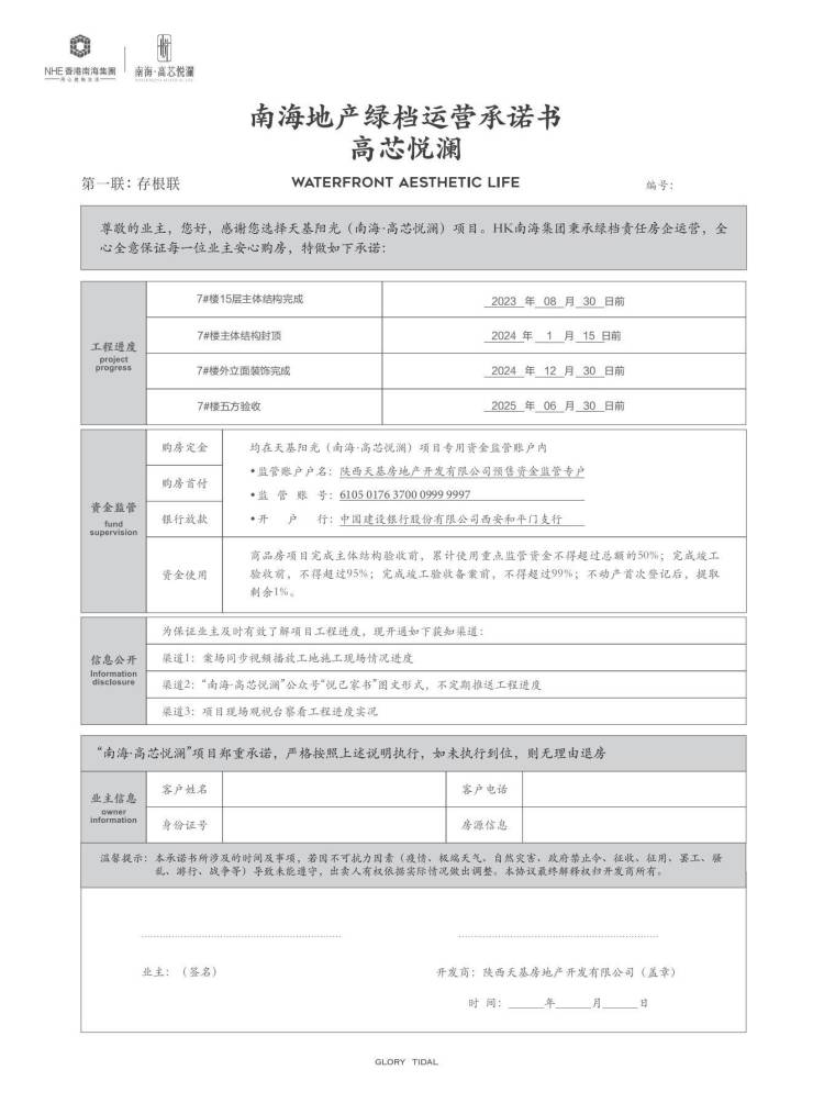 西安项目对外可签署《绿档运营承诺书》,工程进度、资金去向等各类信息全面公开释放,如未达标则客户可无理由退房,保障业主权益。