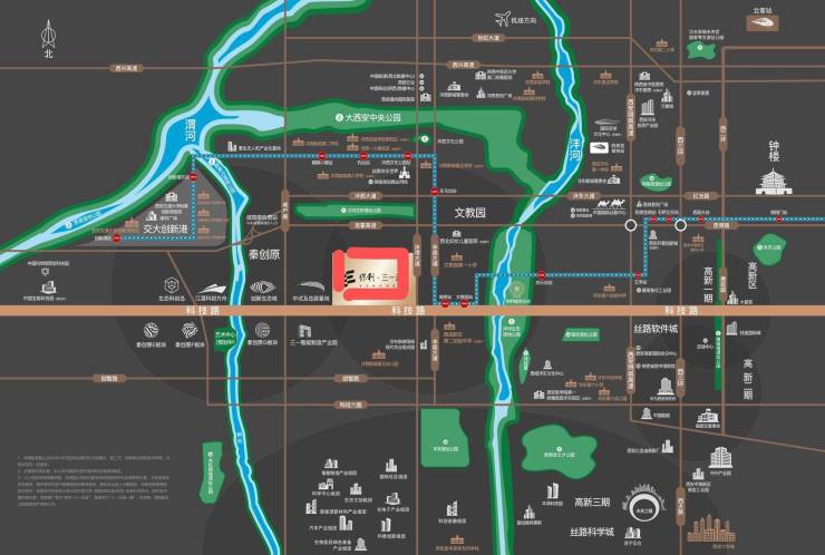 三河:沣河、渭河、新河贯穿,三河交汇,构成约15km的河岸廊道;五园:欢乐谷、诗经里、昆明池、大西安中央公园、沣河湿地公园,让生活回归自然