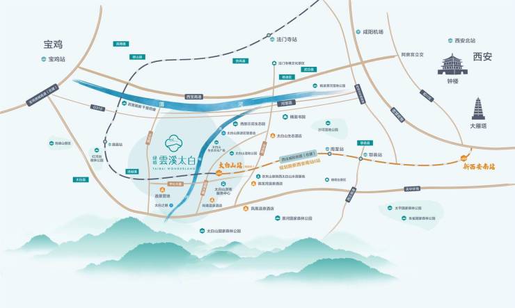 畅捷交通:三纵两横交通路网、中心大道主轴、西法城际铁路太白山站(规划)、连霍高速太白山出口