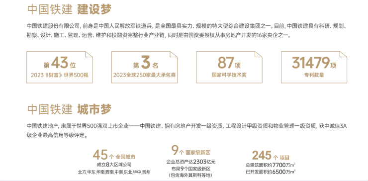 截至2023年,中国铁建位列世界500强第43位,累计荣获87项科学技术奖。中国铁建地产,实力布局京津冀、长三角、珠三角等全国45个城市,匠造245个精品项目。