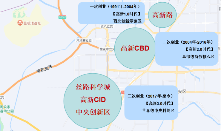 第一次创业主要围绕科技路 ,功能以科技产业为主 ,成为西安最早的产业和经济中心; 由于规划区域严重不能满足发展需求,高新骨架持续拉大。