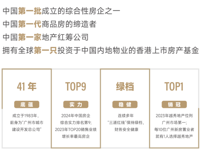【越秀地产】越秀地产1983年成立,深耕楼市41年,全国最早成立的房地产企业之一、中国第一代商品房的缔造者、广州规模最大龙头国企之一,以“城市地标缔造者”身份,共建广州中轴线珠江新城及天河CBD,以“城市美好生活创领者”的使命愿景,不断打造品质标杆人居。