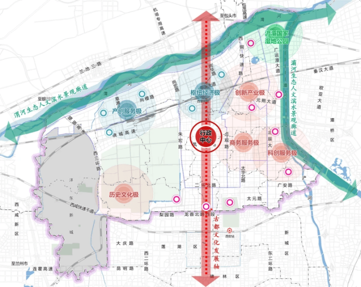 科教创新基地:吸纳西航科研孵化片区、西核科研孵化片区,打造年轻的、有活力的科技中心