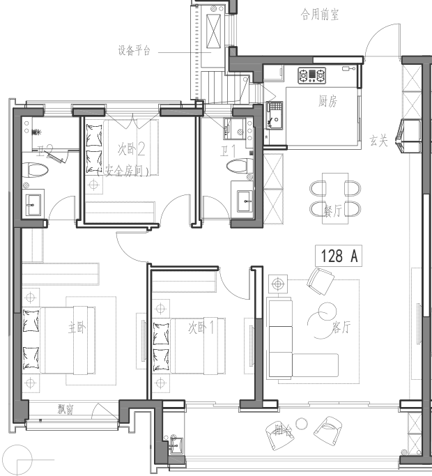 A户型| 建筑面积约128㎡ 三室两厅两卫