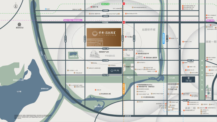 项目出发约1.3KM直抵西北首条智轨——高新云吧【云水一路站】(建设中),约500米无缝换乘地铁3号线二期与12号线(规划中);科技西路、绕城⾼速等城市主⼲道环绕,联动全城。