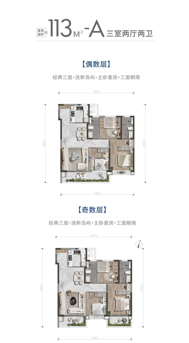 品质三房社区,所有户型均享三面宽,户户南北通透,给足阳光排面,居家即可享环幕视野,风光无界。