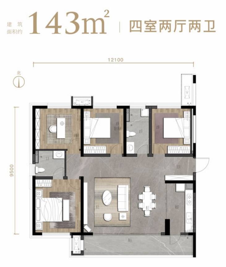 香榭龙轩前瞻高阶人居所需,匠呈建面约120㎡舒阔三室、143㎡奢适四室,为不同家庭提供不同解决方案,方正通透格